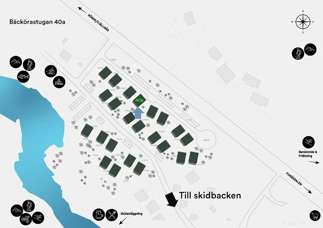 Alla vägar bär till Funäsdalen. Väl där fortsätter du mot Tänndalen och Hamra Livs på kartan här. Där ska ni passera infarten till Tänndalens Fjällodge samt Hamra Livs. Fortsätt på stora vägen ca 250 meter till. På vänster sida ser ni snart området Hamra Bäcköra. Det består av flera fristående gröna stugor i två våningar. Ni tar vänster från stora vägen och svänger sedan direkt vänster igen. Det 4:e huset är vårt hus, Hus 40a.